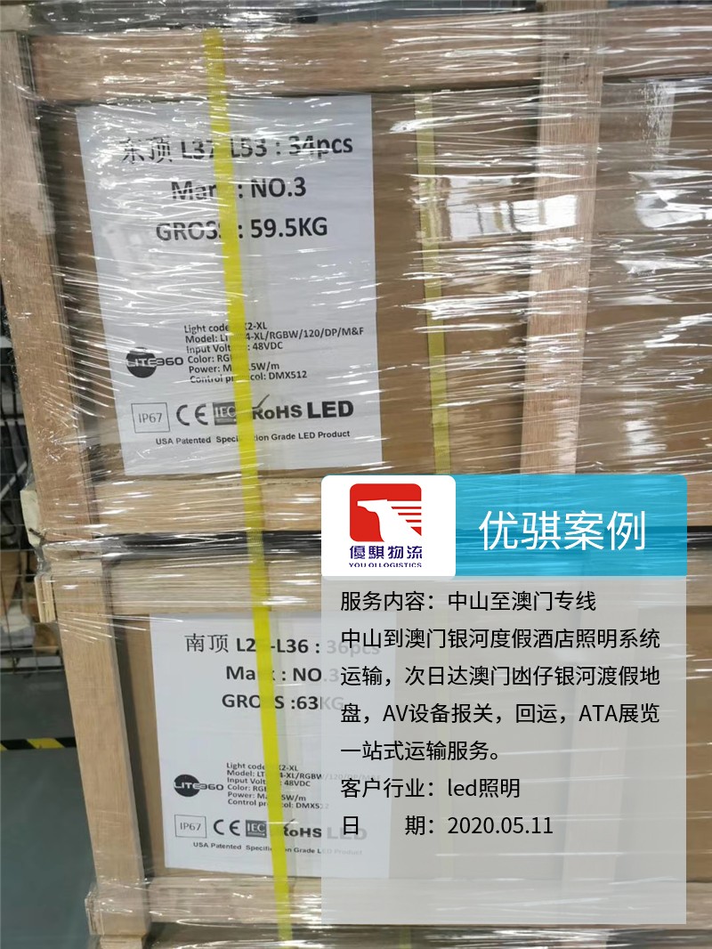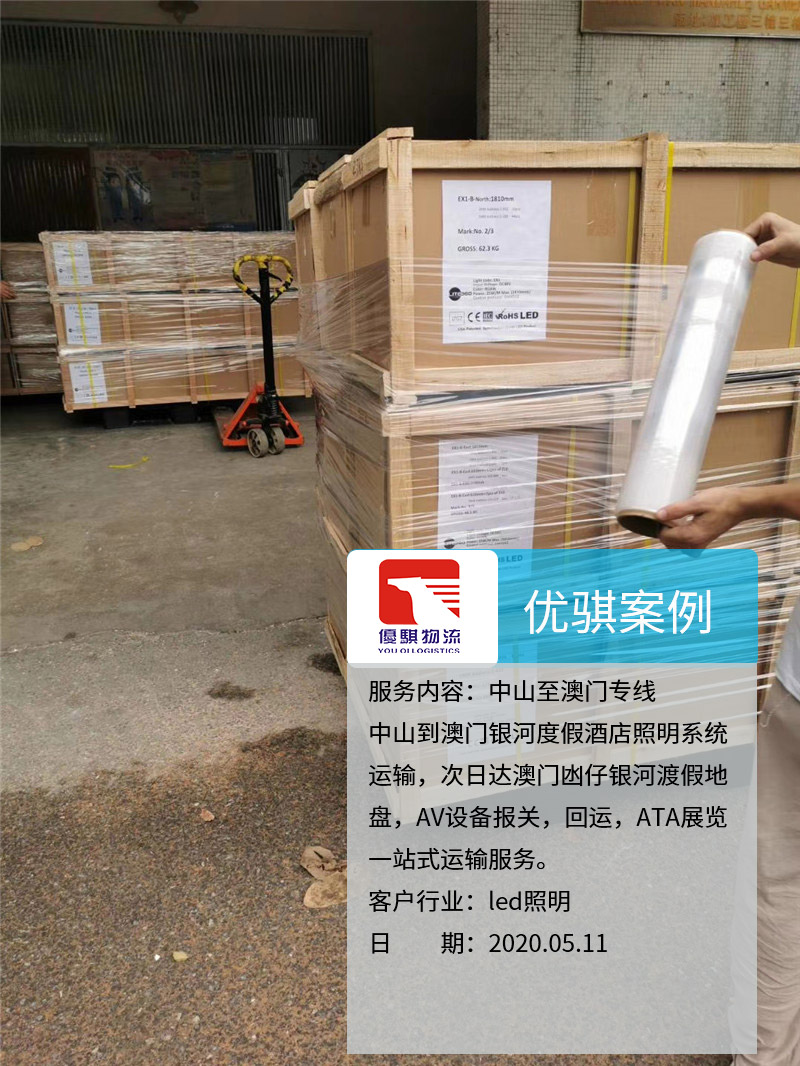 自從我們中山優騏物流開通了中山至澳門的物流專線以后,很多原來物流的同行都介紹業務過來。這個客戶是從中山發燈具到澳門,整個AV設備報關,回運,ATA展覽都是我們完成,獲得了客戶的一致好評,期待下一次的合作。
